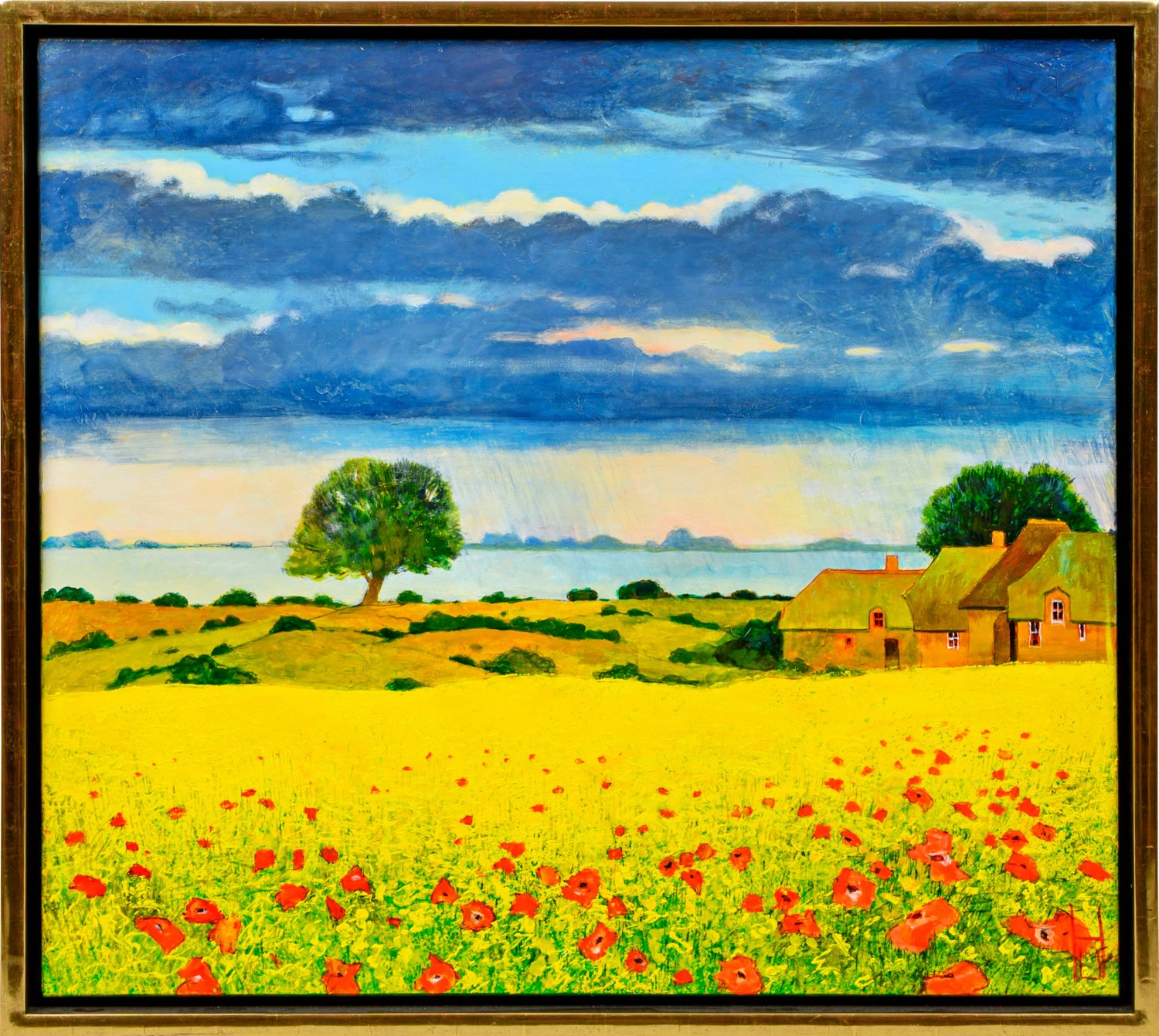 Während im Vordergrund das blühende Rapsfeld kontrastiert durch rote Mohnblüten leuchtend im Sonnenlicht erstrahlt, entlädt sich aus den dunklen, bedrohlich wirkenden Wolken der Regen über dem hellblauen Gewässer im Hintergrund. Stimmungsgeladene, charakteristische Arbeit Herbsts, der nie eine Kunstschule besuchte, sondern sich autodidaktisch durch das Studium der Landschaftsmalerei des französischen Impressionismus und des Expressionismus weiterbildete. Der Künstler kombinierte Stilelemente beider Positionen und führte diese zu seinem eigenen Stil zusammen. Dabei steht die Stimmung, die Temperatur und die Beleuchtung, die seine Werke transportieren, klar im Fokus seines Schaffens. Öl/Lwd.; R. u. monogr. Verso bez. mit Titel. 90 cm x 100 cm. Rahmen.
