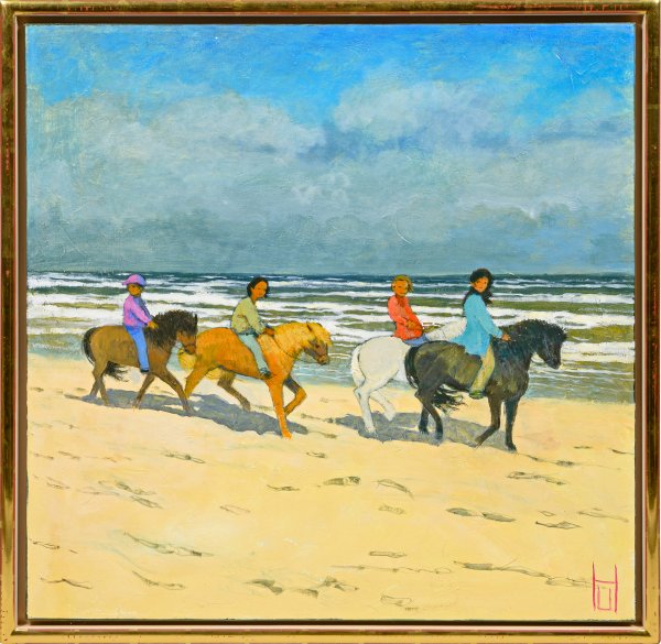 Beleuchtet durch die warmen Strahlen der Sonne reiten vier Kinder auf ihren Ponys über den Strand. Das mit Schaumkronen übersäte Meer und die dunkle Wolkenwand im Hintergrund kündigen ein Unwetter an. Charakteristische Arbeit Herbsts, in der die Wetterstimmung meisterlich eingefangen wurde. Herbst besuchte nie eine Kunstschule, sondern bildete sich autodidaktisch durch das Studium der Landschaftsmalerei des französischen Impressionismus und des Expressionismus weiter, kombinierte Stilelemente beider Positionen und führte diese zu seinem eigenen Stil zusammen. Dabei steht die Stimmung, die Temperatur und die Beleuchtung, die seine Werke transportieren, klar im Fokus seines Schaffens. Öl/Lwd.; R. u. monogr. Verso bez. mit Titel. 79,5 cm x 79,5 cm. Rahmen.