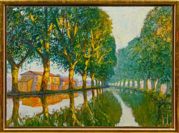 In effektvoller Lichtbehandlung und spannungsreicher Komposition geschilderte, abendliche Partie an einem ruhigen, französischen Kanal, der von prächtigen Laubbäumen und pittoresken Häusern flankiert wird. Charakteristische, stimmungsgeladene Landschaft Herbsts, der nie eine Kunstschule besuchte, sondern sich autodidaktisch durch das Studium der Landschaftsmalerei des französischen Impressionismus und des Expressionismus weiterbildete. Der Künstler kombinierte Stilelemente beider Positionen und führte diese zu seinem eigenen Stil zusammen. Dabei steht die Stimmung, die Temperatur und die Beleuchtung, die seine Werke transportieren, klar im Fokus seines Schaffens. Öl/Lwd.; R. u. monogr. Verso bez. mit Titel. 59,5 cm x 79,5 cm. Rahmen.