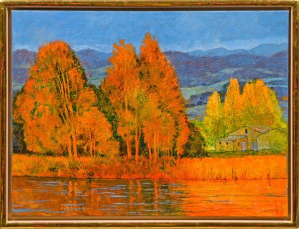 In warmer, rot-orangener Abendsonne inszenierte, mit Schilf bewachsene Uferansicht der Durance mit Bäumen und einem einsamen Hof. Im Hintergrund erheben sich sanft die Hügel des Umlandes, die bereits in die kühle Farbpalette der Nacht gehüllt sind. Atmosphärisches, charakteristisches Werk Herbsts, der nie eine Kunstschule besuchte, sondern sich autodidaktisch durch das Studium der Landschaftsmalerei des französischen Impressionismus und des Expressionismus weiterbildete. Der Künstler kombinierte Stilelemente beider Positionen und führte diese zu seinem eigenen Stil zusammen. Dabei steht die Stimmung, die Temperatur und die Beleuchtung, die seine Werke transportieren, klar im Fokus seines Schaffens. Öl/Lwd.; R. u. monogr. Verso bez. mit Titel. 59,5 cm x 80 cm. Rahmen.