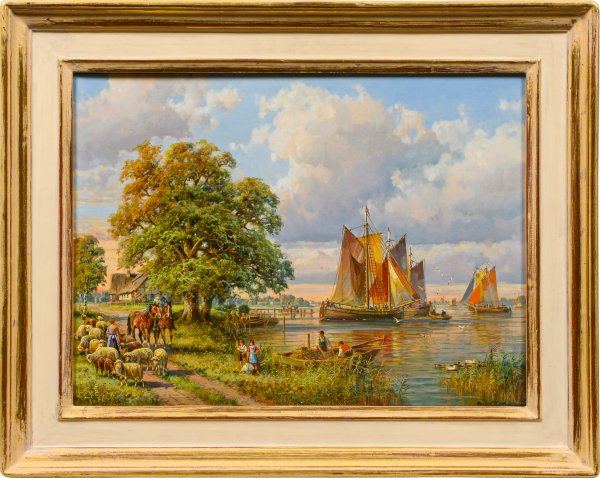 Heitere Landpartie bei Keitum, belebt von reger Personenstaffage, darunter zahlreiche Fischer, angelnde Kinder, ein Bauer mit Pferden und eine Magd mit ihrer Schafsherde. Feinflüssig gemaltes, detailreich komponiertes Werk des an der Münchener Akademie ausgebildeten Tier- und Landschaftsmalers. Sein malerischer Stil, der sich durch subtile Naturbeobachtung, äußerst lebendige Wiedergabe, effektvolle Lichtführung und virtuoses Kolorit auszeichnet, knüpft hierin nahtlos an die ältere Münchener Schule des 19. Jhs. und der Zeit um 1900 an. Öl/Lwd., R. u. sign.; Verso nochmals über Papieretikett mit Werk-Nr. A4812777L5 sign.; 30,5 cm x 40 cm. Rahmen.