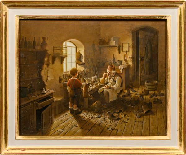 Zeittypische Werkstatt des 19. Jhs. mit detaillreicher Staffage und meisterlicher Licht- und Schattenbehandlung, in der ein kleiner Junge dem erstaunten Schuhmacher einen Lederstiefel mit beschädigter Sohle präsentiert. In sehr fein lasierender Malerei ausgeführtes, charakteristisches, in seiner Figurenschilderung und effektvollen Lichtführung typisches Werk des ungarischen Künstlers. Ab 1961 entfaltete Vida eine vielseitige künstlerische Tätigkeit, 1977 begann er verstärkt zu malen. In altmeisterlicher, fein lasierender Schichtenmalerei führte er seine Genrebilder mit pittoresken nostalgischen Motiven aus. Der besonderer Reiz von Vidas Werken liegt in der vortrefflichen Verbindung von meisterhafter Stofflichkeit und ausdrucksvoller Charakterisierung der Figuren mit subtilem Humor. Oft schilderte er wie Carl Spitzweg kauzig wirkende ältere Männer bei ihren Tätigkeiten und Passionen. Öl/Holztafel. R. u. sign.; 40 cm x 50 cm. Rahmen.
