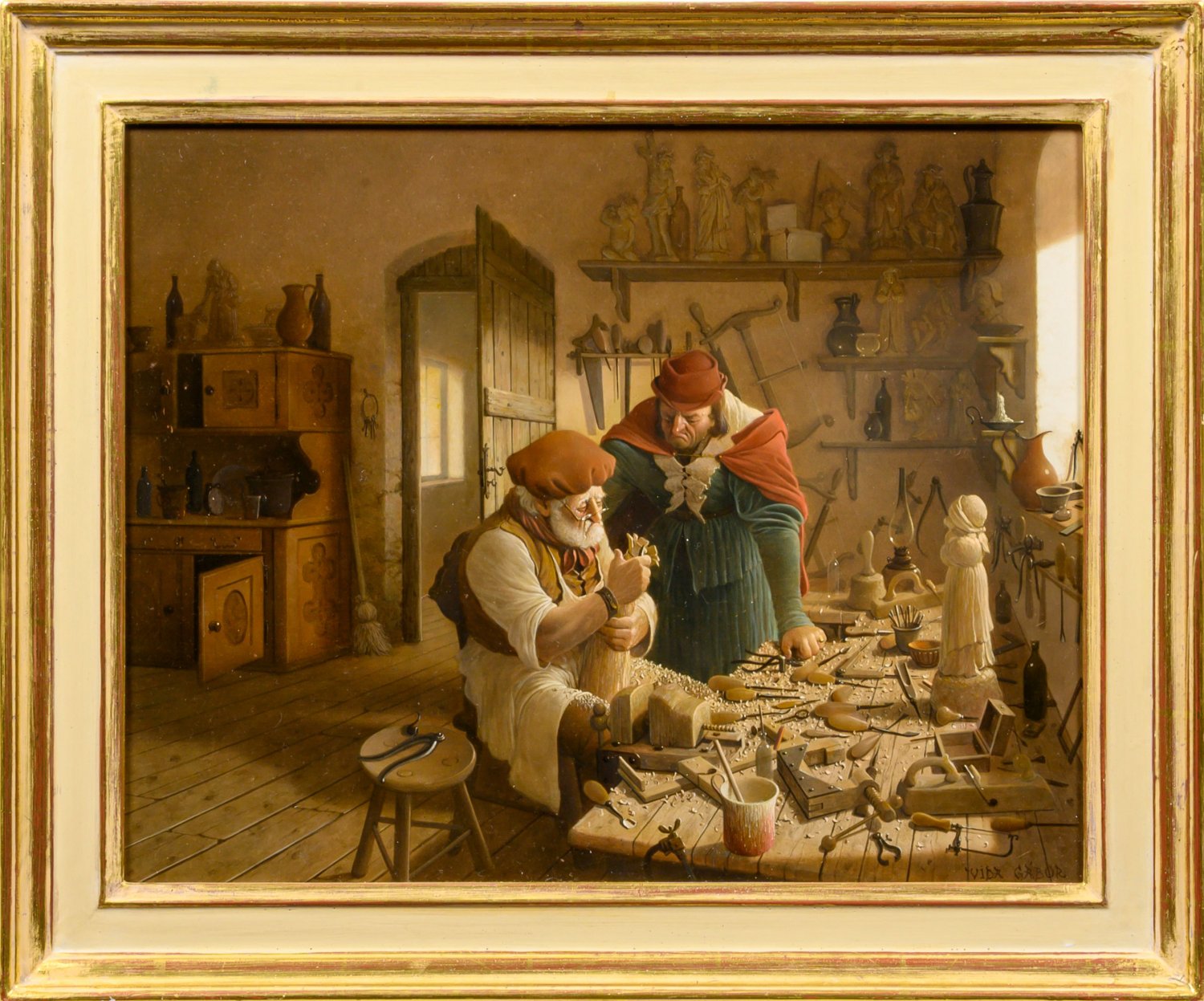 Detailreich inszenierte, historisierende Genreszene, die eine Holzwerkstatt schildert, in der der Auftraggeber und der Schnitzer kritisch und sichtlich unzufrieden den Entstehungsprozess der Schnitzarbeit begutachten. In sehr fein lasierender Malerei ausgeführtes, charakteristisches, in seiner Figurenschilderung und effektvollen Lichtführung typisches Werk des ungarischen Künstlers. Ab 1961 entfaltete Vida eine vielseitige künstlerische Tätigkeit, 1977 begann er verstärkt zu malen. In altmeisterlicher, fein lasierender Schichtenmalerei führte er seine Genrebilder mit pittoresken nostalgischen Motiven aus. Der besondere Reiz von Vidas Werken liegt in der vortrefflichen Verbindung von meisterhafter Stofflichkeit und ausdrucksvoller Charakterisierung der Figuren mit subtilem Humor. Oft schilderte er wie Carl Spitzweg kauzig wirkende ältere Männer bei ihren Tätigkeiten und Passionen. Öl/Holztafel. R. u. sign.; 40 cm x 50 cm. Rahmen.