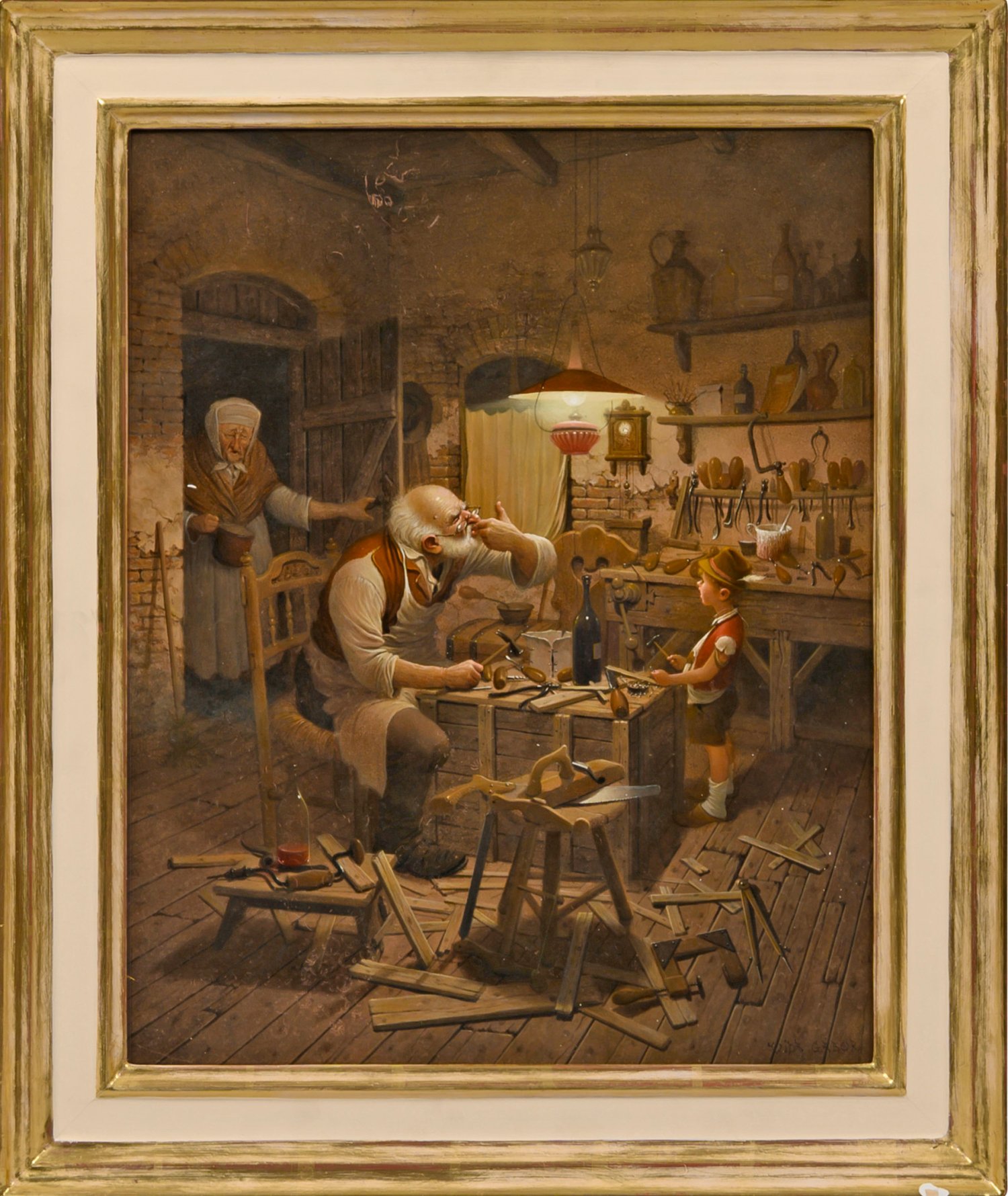 Im Schein einer einzelnen Deckenleuchte öffnet sich der Blick in eine detailreich und unordentlich ausstaffierte Schreinerwerkstatt. Während ein kleiner Knabe gerade seine Arbeit unterbricht und seinen Blick gen Tür richtet, durch die seine Großmutter mit einem Kessel den Raum betritt, stochert der Großvater mit seinem Zeigefinger in seinem Mund. In sehr fein lasierender Malerei ausgeführte, charakteristische, in seiner Figurenschilderung und effektvollen Lichtführung typische Genreszene des ungarischen Künstlers. Ab 1961 entfaltete Vida eine vielseitige künstlerische Tätigkeit, 1977 begann er verstärkt zu malen. In altmeisterlicher, fein lasierender Schichtenmalerei führte er seine Genrebilder mit pittoresken nostalgischen Motiven aus. Der besondere Reiz von Vidas Werken liegt in der vortrefflichen Verbindung von meisterhafter Stofflichkeit und ausdrucksvoller Charakterisierung der Figuren mit subtilem Humor. Oft schilderte er wie Carl Spitzweg kauzig wirkende ältere Männer bei ihren Tätigkeiten und Passionen. Öl/Holztafel. R. u. sign.; 50 cm x 40 cm. Rahmen.