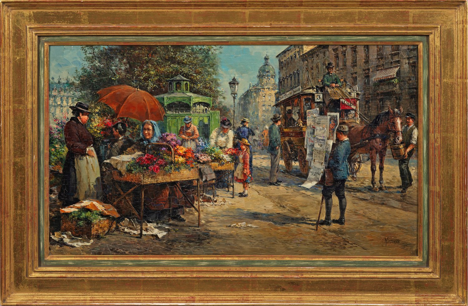 Nostalgisches, sommerlich gestimmtes Motiv der wilhelminischen Zeit um 1900. Impressionistisches, lebendig aufgefasstes, lichterfülltes Werk Nitschkes. Der Künstler studierte nach einer Ausbildung zum Lithographen (1950-1954) an der Meisterschule für Druck und Grafik in Berlin bei Johannes Boehland und an der Berliner Hochschule der Künste bei Heinz Kraus. Mit Vorliebe hält Nitschke nostalgische Motive, Veduten und Straßenszenen aus den europäischen Metropolen (wie Berlin, Paris und Wien) um 1900 fest, in denen er die heitere, atmosphärische Stimmung und das pulsierende großstädtische Leben der Belle Epoque widerspiegelt. Öl/Holzplatte. R. u. sign.; 30 cm x 52 cm. Rahmen.