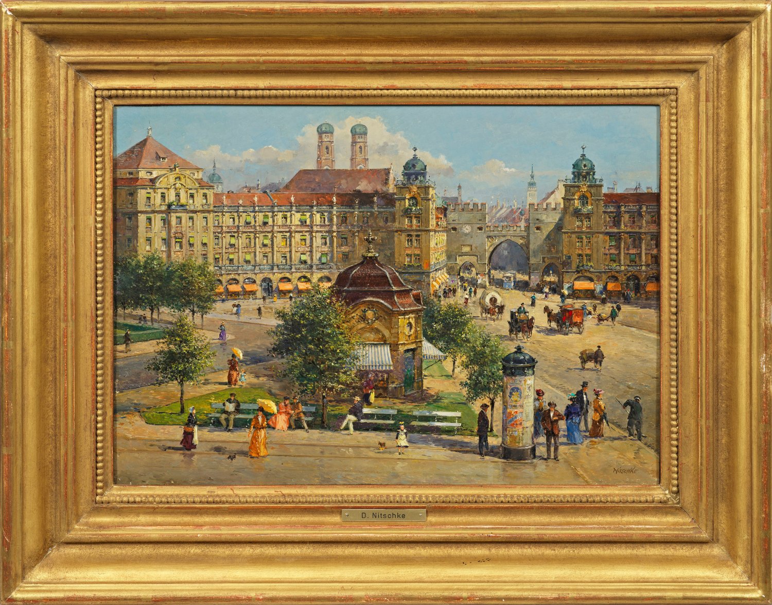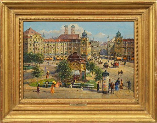Reizvolle, subtil geschilderte, durch Figuren und Kutschen belebte Ansicht des Münchener Karlsplatzes aus der Zeit um 1900. Im Vordergrund der 1901 neu errichtete Blumenpavillon, im Hintergrund das Karlstor mit den beiden flankierenden Rondellbauten, dahinter überragt von den beiden Zwiebeltürmen der Frauenkirche. Impressiv aufgefasstes, repräsentatives Werk Nitschkes, der mit Vorliebe nostalgische Veduten, Straßen-, Café-, Biergarten- und Parkszenen in den europäischen Metropolen der Belle Epoque bzw. Kaiserzeit malt, welche die unbeschwert heitere, atmosphärische Stimmung und das pulsierende großstädtische Leben jener Jahre wiedergeben. Öl/Mahagonitafel. R. u. sign.; 28 cm x 40 cm. Rahmen.