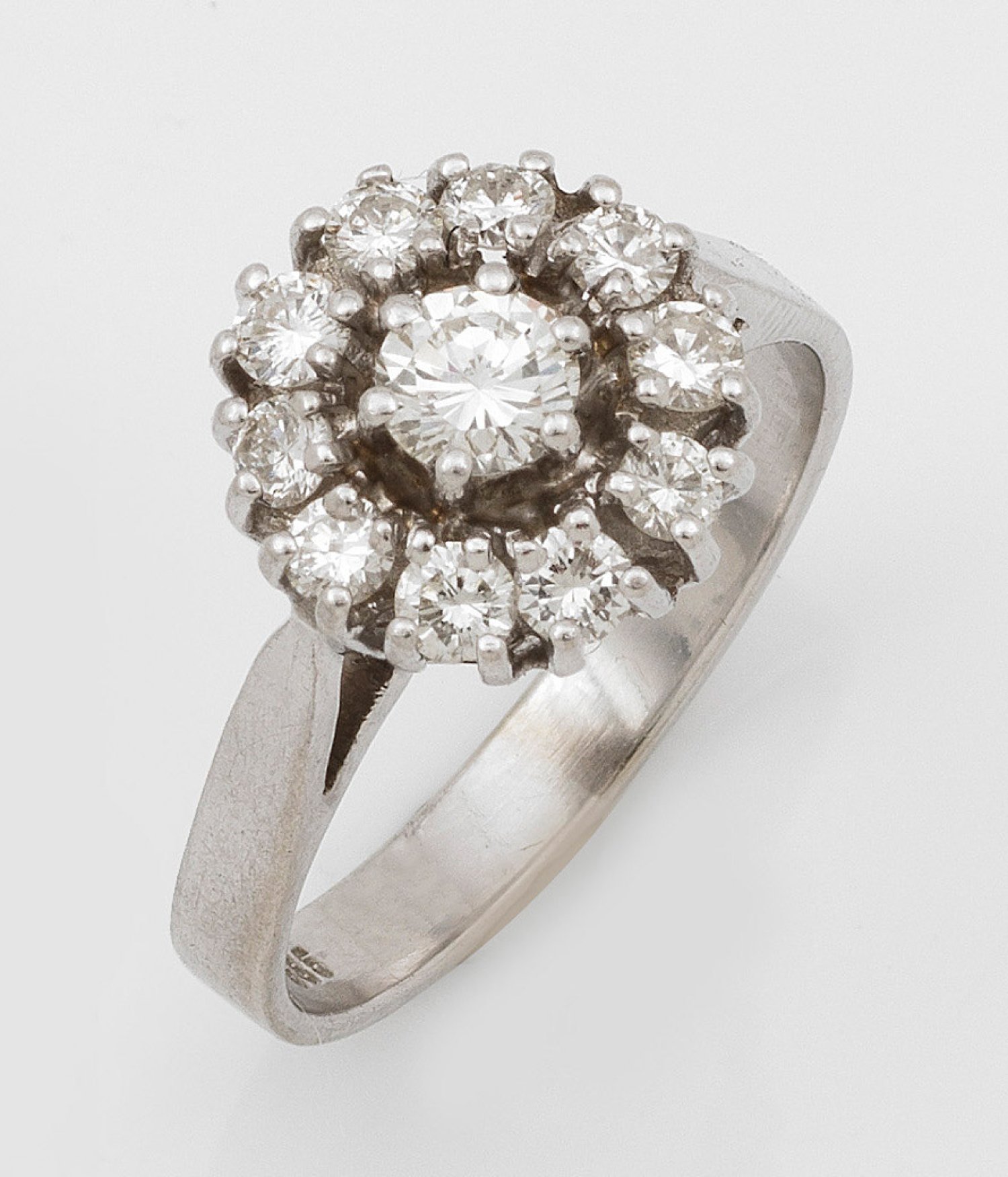 Weißgold, gest. 585. Zentral besetzt mit einem Brillanten von 0,20 ct., entouriert von kleinen Brillanten von zus. ca. 0,50 ct. (G-H/vs-si). Gew. ca. 4,13 g.