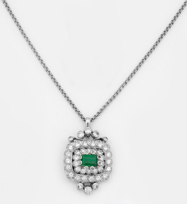 Weißgold, 14 ct. sowie gest. 750. Kartuschenförmiger Anhänger besetzt mit einem Smaragd von ca. 1,00 ct., umrahmt von Brillanten von zus. ca. 2,40 ct., an feiner Chopard-Erbsenkette. Ges.-Gew. ca. 16,60 g.