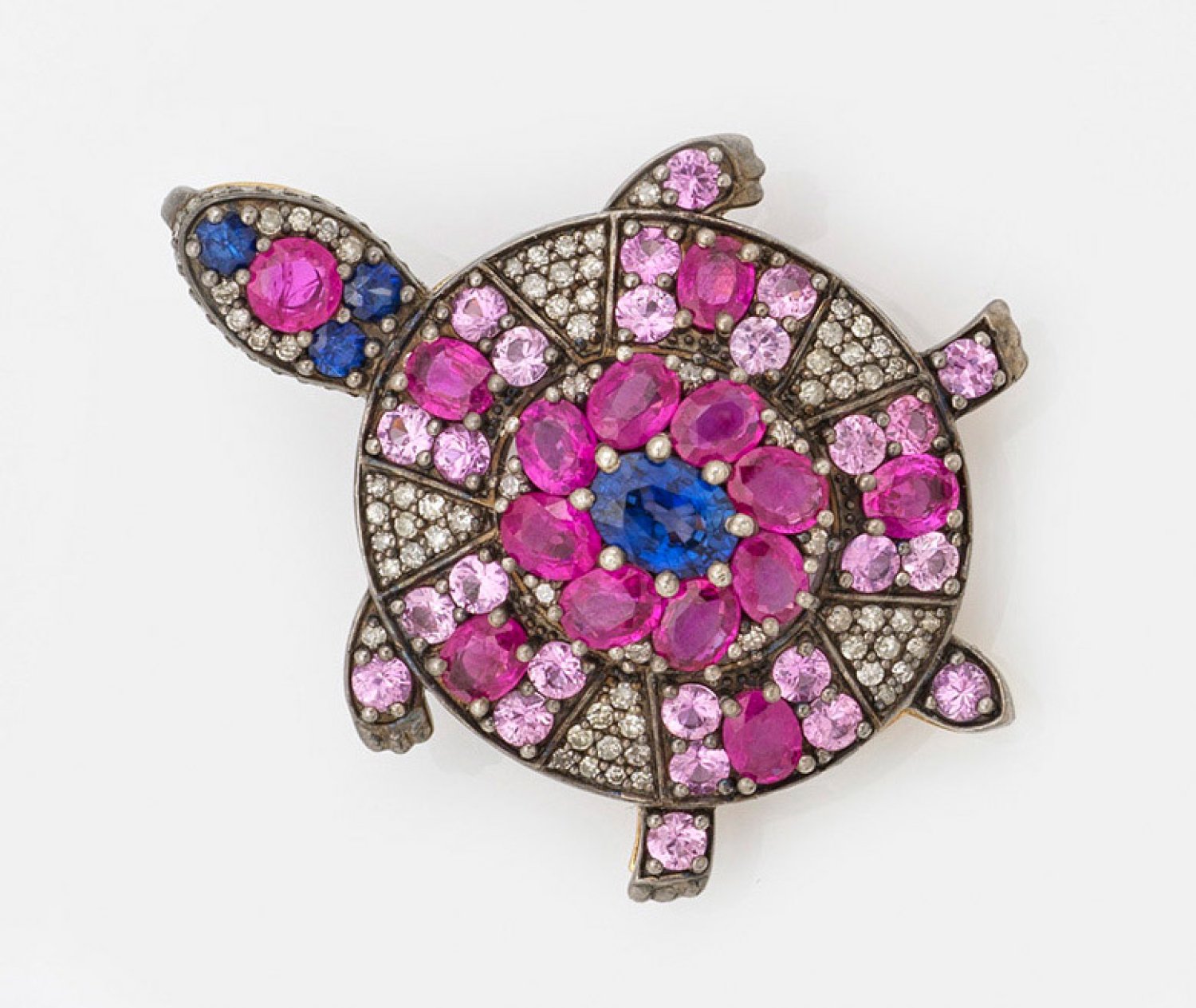 Turtle brooch set with pink and blue sapphires approx. 3,00 ct. and diamonds approx. 0,71 ct., in silver and 14 k gold.