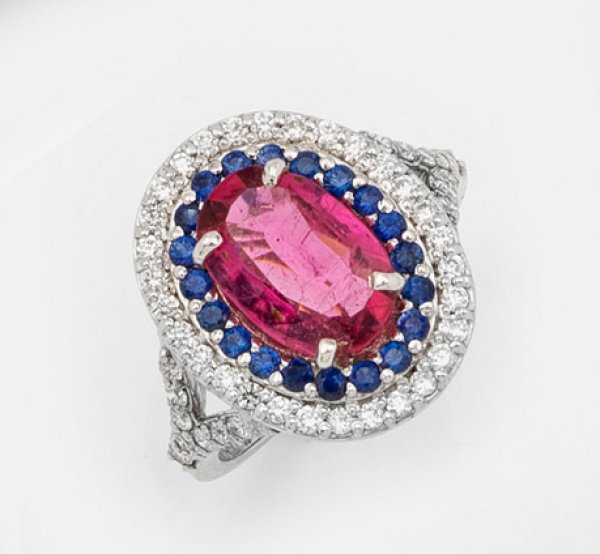 Weißgold, gest. 750. Zentral besetzt mit einem himbeerfarbenen Turmalin von ca. 2,50 ct., entouriert von Diamanten zus. ca. 0,80 ct. und Saphiren zus. ca. 0,30 ct.; Gew. ca. 5,88 g.