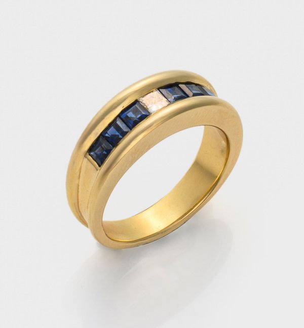 Gelbgold, gest. 750. Linear besetzt mit kornblumenblauen Saphircarrées von zus. ca. 1,05 ct. und einem Diamant im Princesscut von ca. 0,10 ct. (H/si). Herstellerzeichen. Ges.-Gew. ca. 30,00 g. Sehr schöne Goldschmiedeausführung.