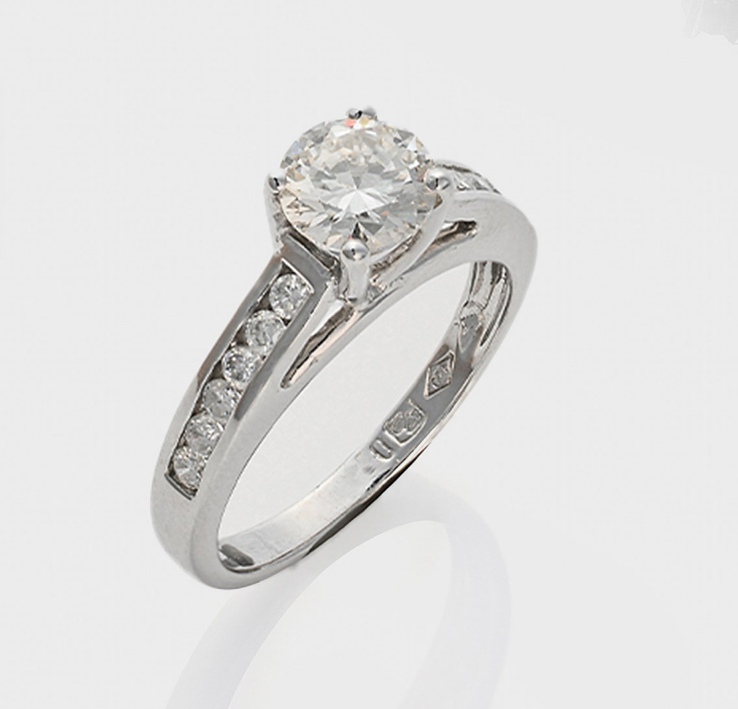 Ring set with a brilliant solitaire approx. 1,04 ct. (G/vsi) and brilliants approx. 0,50 ct., in 18 k white gold.