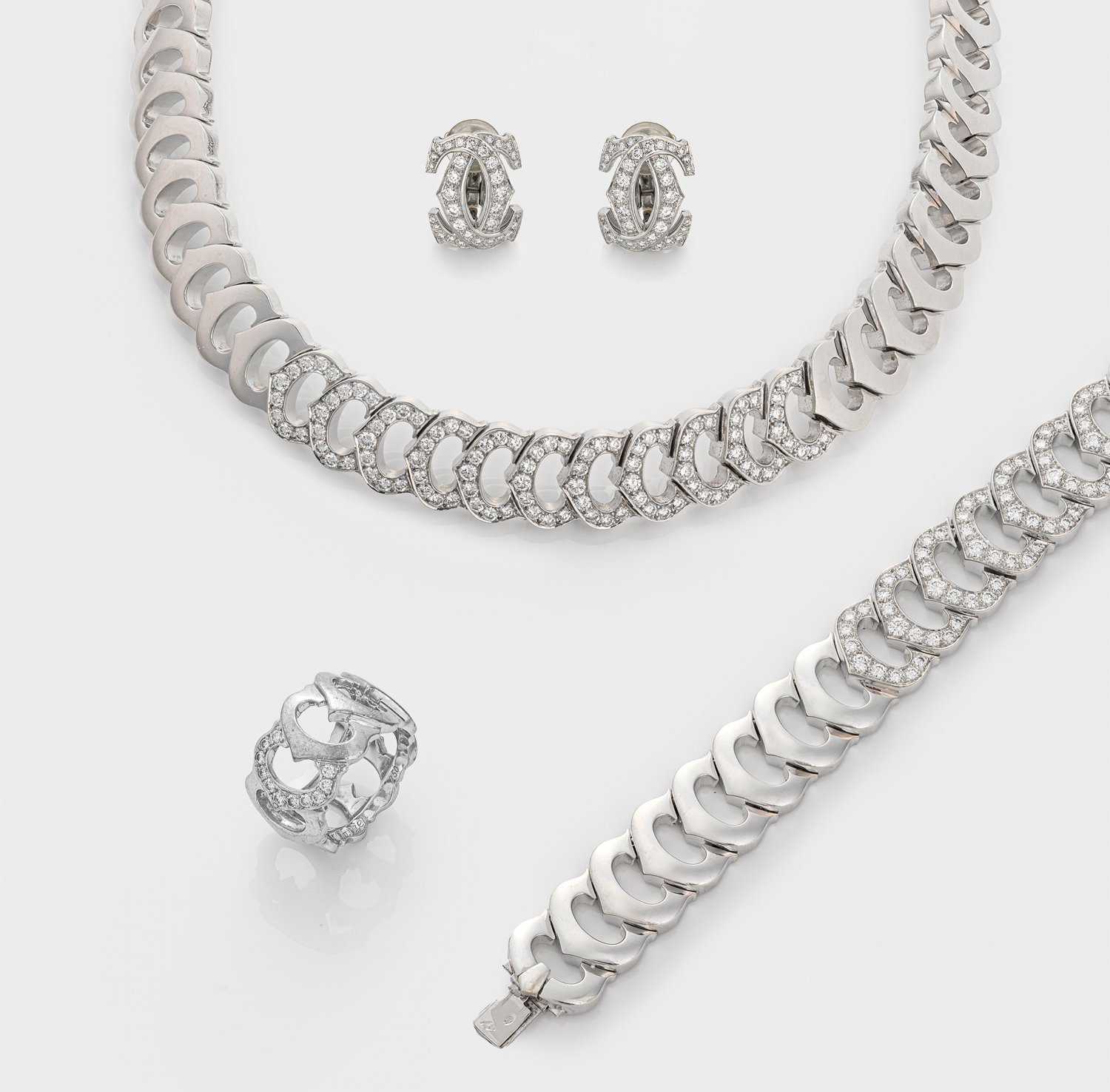 Collier, korrespondierender Ring, Paar Ohrclips und Armband. Weißgold, gest. 750. Breite Bandform aus C-Sprüngen in Ajour, ausgefasst mit Brillanten von zus. ca. 9,40 ct. (D-F/vvs1-2). Herstellerzeichen. Ref.-Nr. N7019600, N6022300, N4123351, N8020200. Ges.-Gew. ca. 208,95 g. Original rote, goldgeprägte Lederbox und Papiere. Beiliegend Original Maison Cartier-Rechnungen aus dem Jahr 2000 über € 48.500,- sowie Zertifikate.