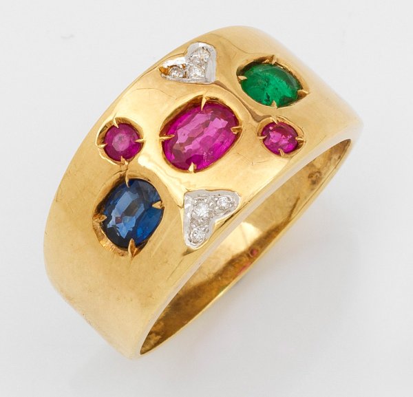 Ring set with 3 rubies approx. 0,50 ct., sapphire approx. 0,40 ct., emerald approx. 0,30 ct. and small diamonds, in 18 k red gold.