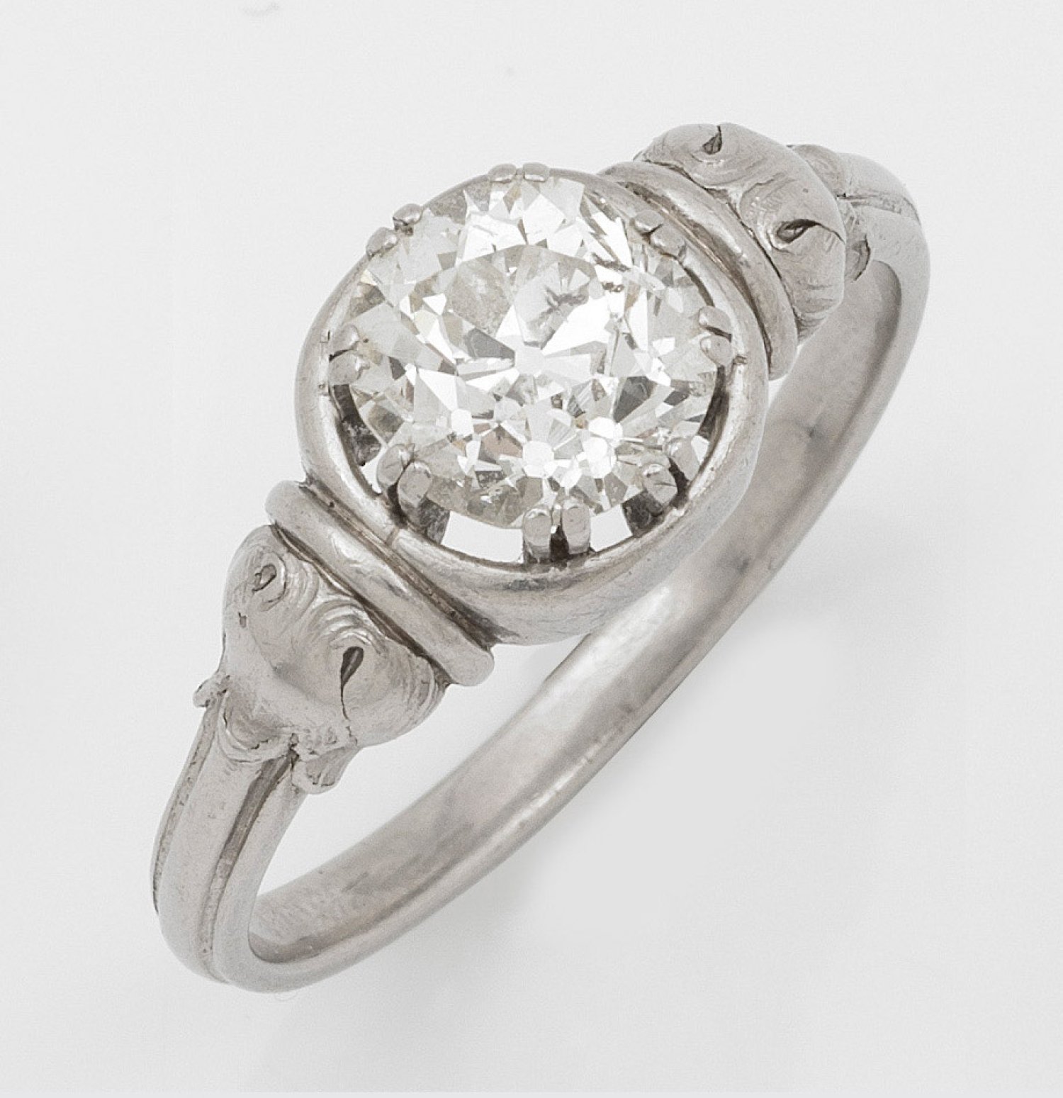 Weißgold 14 ct.; Zentral besetzt mit einem Altschliffdiamanten von ca. 1,50 ct. (K/si3-i1). Gew. ca. 8,13 g.