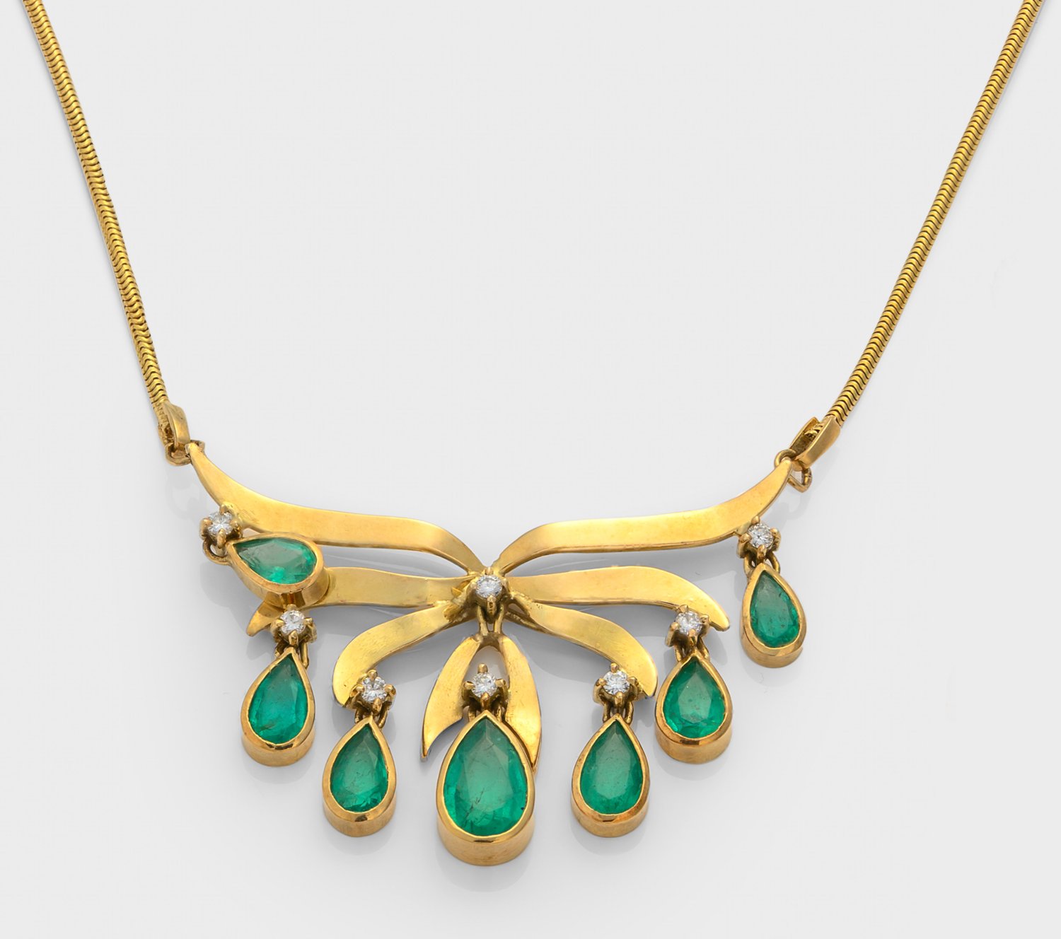 Gelbgold, gest. 750. An feiner Schlangenhautkette blütenartiger Anhänger, besetzt mit leuchtendgrünen Smaragdtropfen von zus. ca. 5,90 ct., akzentuiert durch Brillanten von zus. ca. 0,40 ct.; Gew. ca. 20,82 g.