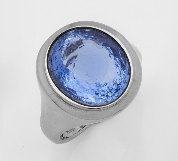 Platin, gest. 900. Zentral besetzt mit Tansanit von ca. 9,00 ct. im Ovalschliff. Minim. Chips. Gew. ca. 8,37 g.