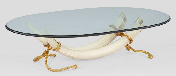 Farbloses Glas, sog. Faux-Elfenbein aus elfenbeinfarbenem Harz und vergoldetem Messing. Korpus aus zwei nebeneinander angeordneten, reproduzierten Stoßzähnen eines Elefantenbullen mit Kappen, durch üppige Kordelstränge als Stützen verbunden. Oberhalb gerundete, profilierte Deckplatte. H. 42 cm. 175 cm x 98 cm.
