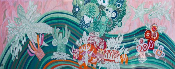 Wolle auf Wolle, in unterschiedlichen Grün-, Orange und Rosétönen, flach gewebt. Flächendeckend stilisierte Landschaftsdarstellung mit großen Floralelementen. Rechts unten bez. A 73. 1040 cm x 324 cm.