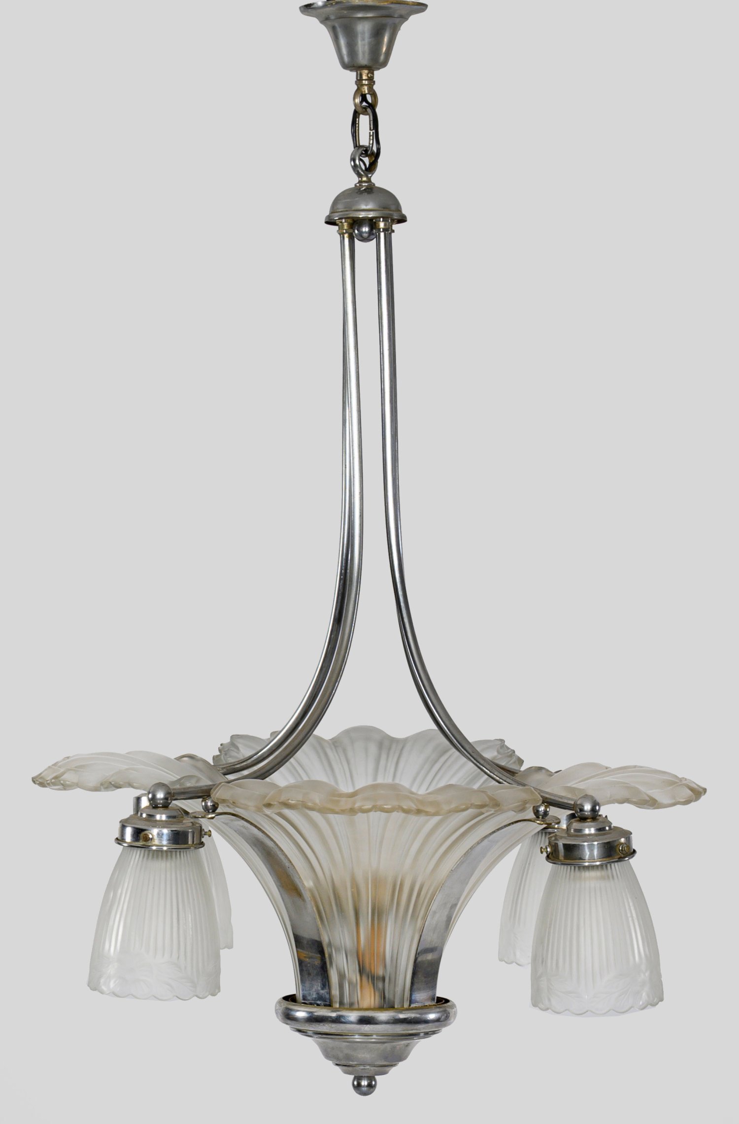 4-flg.; Metall verchromt sowie farbloses, satiniertes Glas. Kelchförmiger Korpus mit fächerförmigen Glaseinsätzen an hohen, geschweift ansteigenden Streben. Korrespondierende, kelchförmige Lampenschirme. Innen vier weitere Lampenfassungen. Elektrifiziert. H. 83 cm. D. 53 cm.