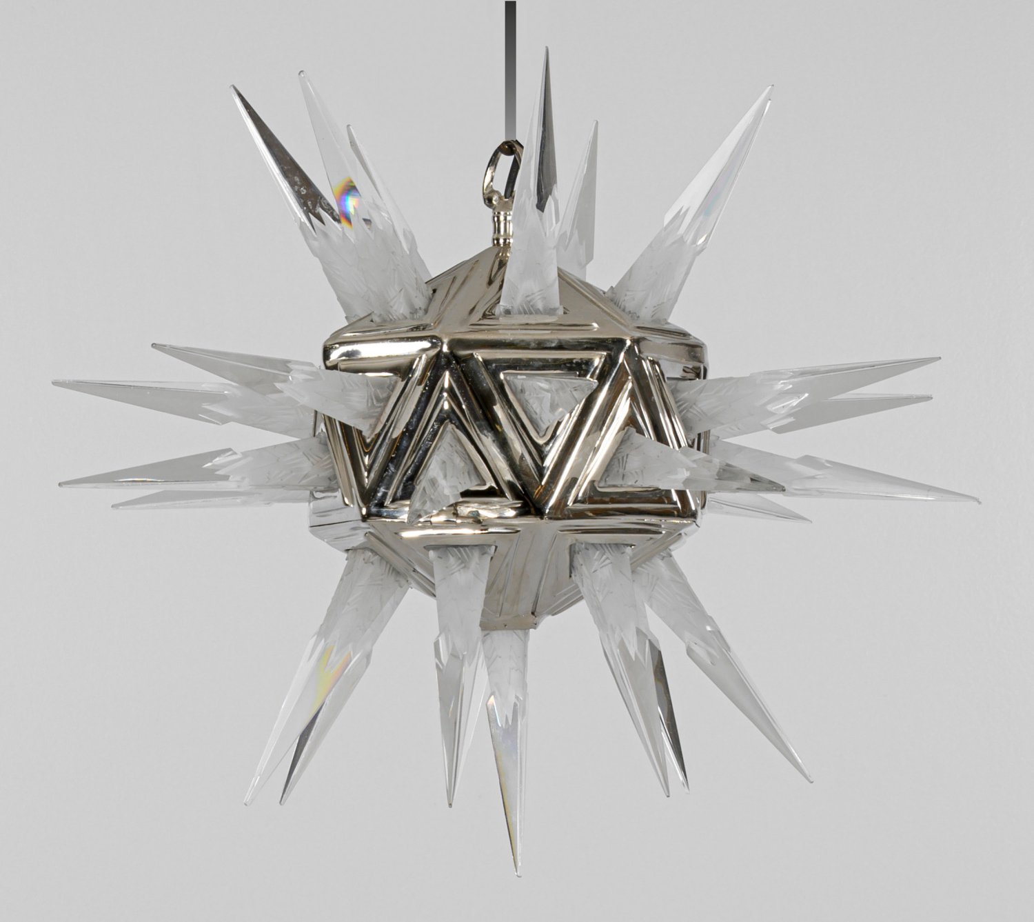 1-flg.; Metall, vernickelt sowie farbloses, teilw. satiniertes Glas. Vielfach gekanteter Korpus aus Profilstegen. Davon ausgehend unterschiedlich lange, spitz zulaufende Glaskörper in Form von Eiszapfen. Entw. um 1931. Elektrifiziert. H. 50 cm. D. 55 cm.