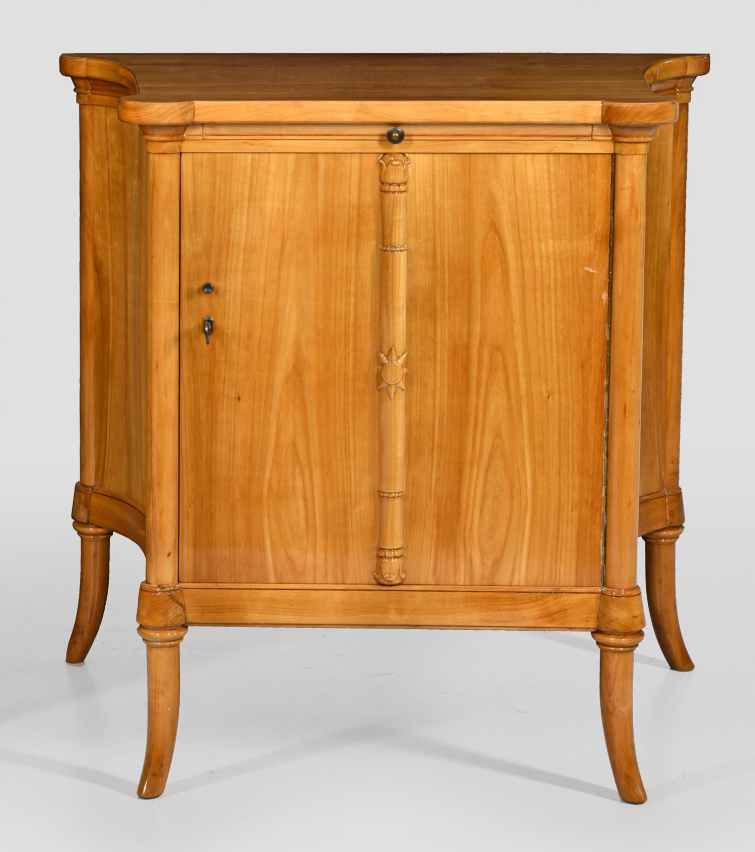 Kirschbaum, massiv und furniert. Rechteckiger, seitlich konkav eingezogener Korpus, flankiert von gerundeten Ecklisenen, in entsprechende, leicht ausgestellte Beine übergehend. In der gegliederten Front große Tür, mittig mit reliefplastischem Pilaster sowie ausziehbare Abstellfläche. Innen konkav ausgesparter Einlegeboden. Gering überstehende, profilierte Deckplatte. H. 79 cm.79 cm x 51 cm.