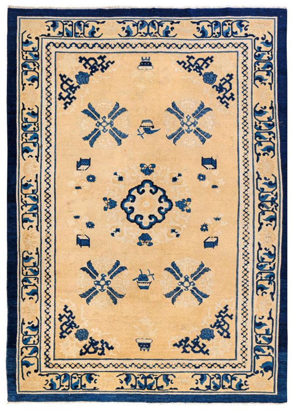 China. Peking. 1. Hälfte 20. Jh.; Wolle auf Baumwolle. Im cremefarbenem Innenfeld Zentralmedaillon aus Wolkenband umgeben von offen gestalteten Rundmedaillons und unterschiedlichen Symbolen. Umlaufende Bordüre mit Musterung in zweifarbigem Blau. 185 cm x 265 cm.