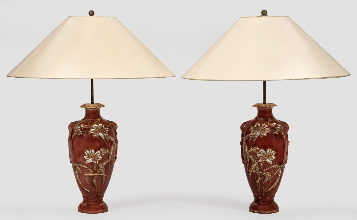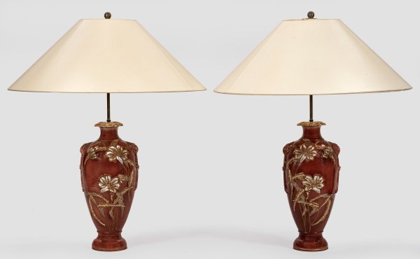 2-flg.; Keramik, ochsenblutrot und cremefarben glasiert sowie partiell vergoldet. Balusterförmiger Korpus, seitlich mit erhaben reliefierten Löwenmaskarons und Quasten. Flächendeckend erhaben reliefierter Dekor aus Lilienblüten. Oberhalb schlanker Schaft als Träger für Leuchtmittel. Konische, besch. Lampenschirme. Elektrifiziert. H. 84 cm.