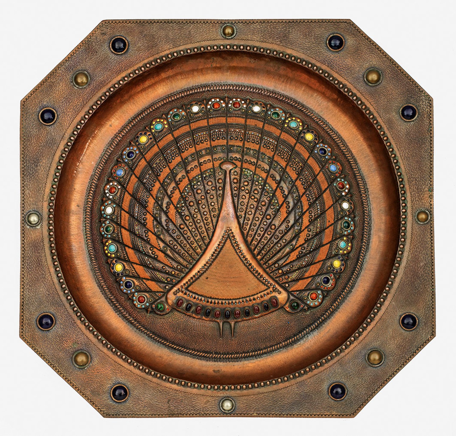 Kupfer, getrieben und ziseliert, teilw. emailliert. Cabochons mit farbigen Glassteinen. Oktogonales, von persischen Pfauenplatten inspiriertes Objekt mit konvex gewölbtem, rundem Spiegel und stilisiertem Dekor, entstanden wohl im Umkreis von Ludwig Vierthaler und der Debschitz-Schule in München. Sign. "MOHR" sowie "4" (oder "L"). 50 cm x 50 cm.