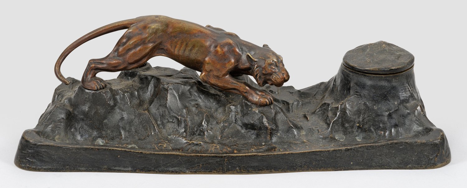 Bronze, dunkel patiniert; Glaseinsatz. Vollplastische Darstellung des Tigers auf einem länglichen, stilisierten Landschaftssockel mit scharniertem Tintenfass, vorderseitig eine flache Federmulde. H. 13 cm; B. 42 cm.