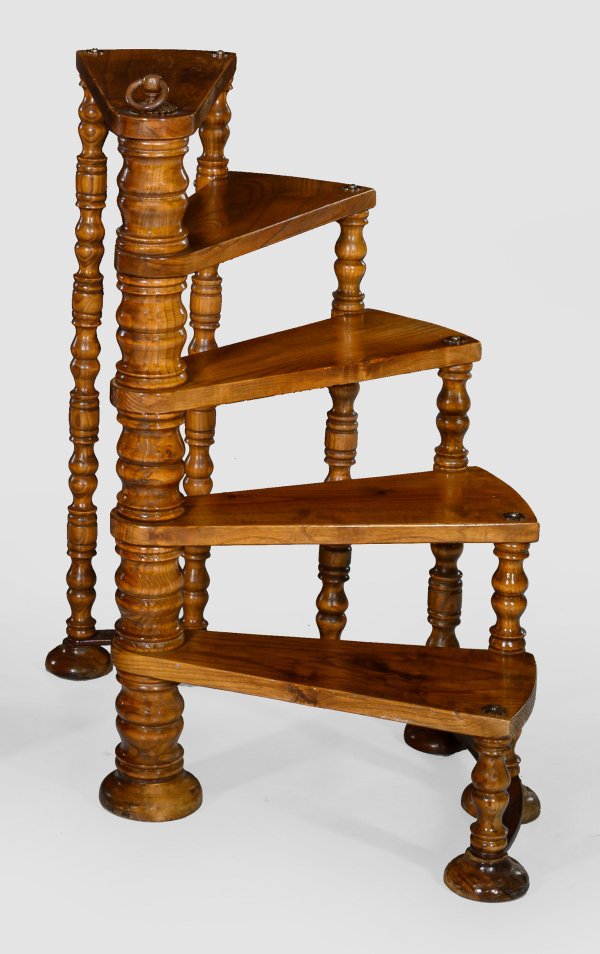 Eichenholz und Eisen. Offen gestalteter Korpus aus mehrfach gegliederten Balusterstreben und gebogten Stegen als Träger für gedreht angeordnete Treppenstufen. H. 83 cm.