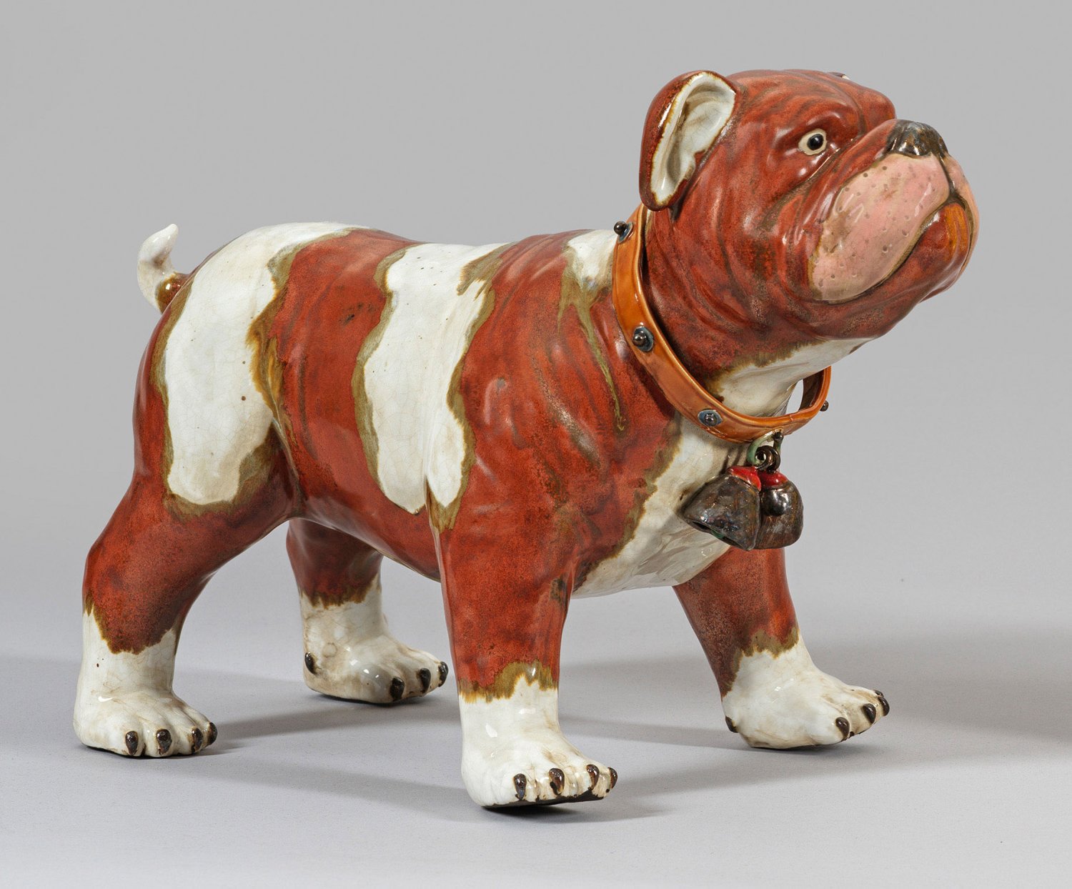 Keramik. Große, vollplastische Darstellung einer aufschauenden Bulldogge, das Halsband mit kleinen Nieten und zwei Glöckchen. Weiße, leicht craquelierte Zinnglasur, polychrome Bemalung. Undeutl. Pressmarke. H. 28 cm; L. 39,5 cm.