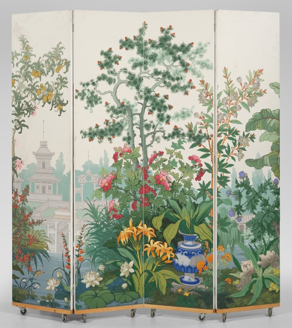 4-tlg.; Holz, teilw. mit flächendeckender Tapetenbespannung. Gerade, hochrechteckige Paneele auf erg. Rollen. Schauseitig flächendeckender Dekor eines chinesischen Schlossparks mit Pagodenarchitektur, Seerosen, Kiefern und Päonien. Pro Paneel: 224 cm x 53 cm.
