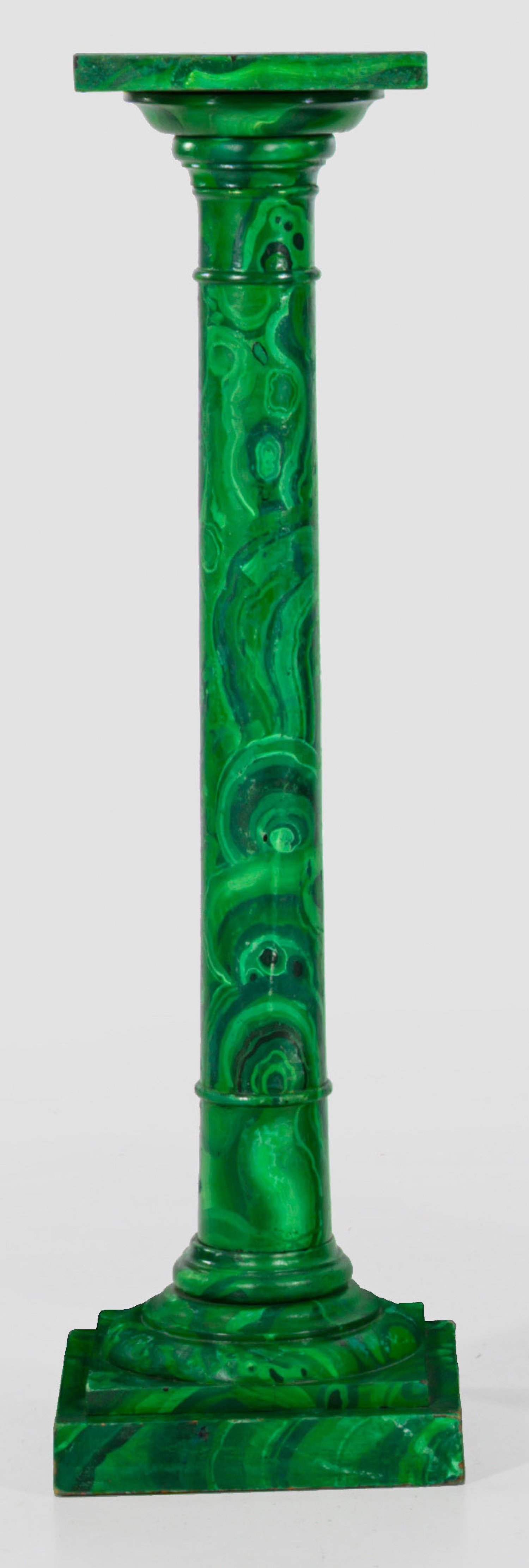 Holz mit flächendeckendem Dekor in Malachitoptik. Über quadratischer, gestuft ansteigender Plinthe profilierte Basis als Träger für Säulenschaft und quadratische Deckplatte. H. 114 cm.