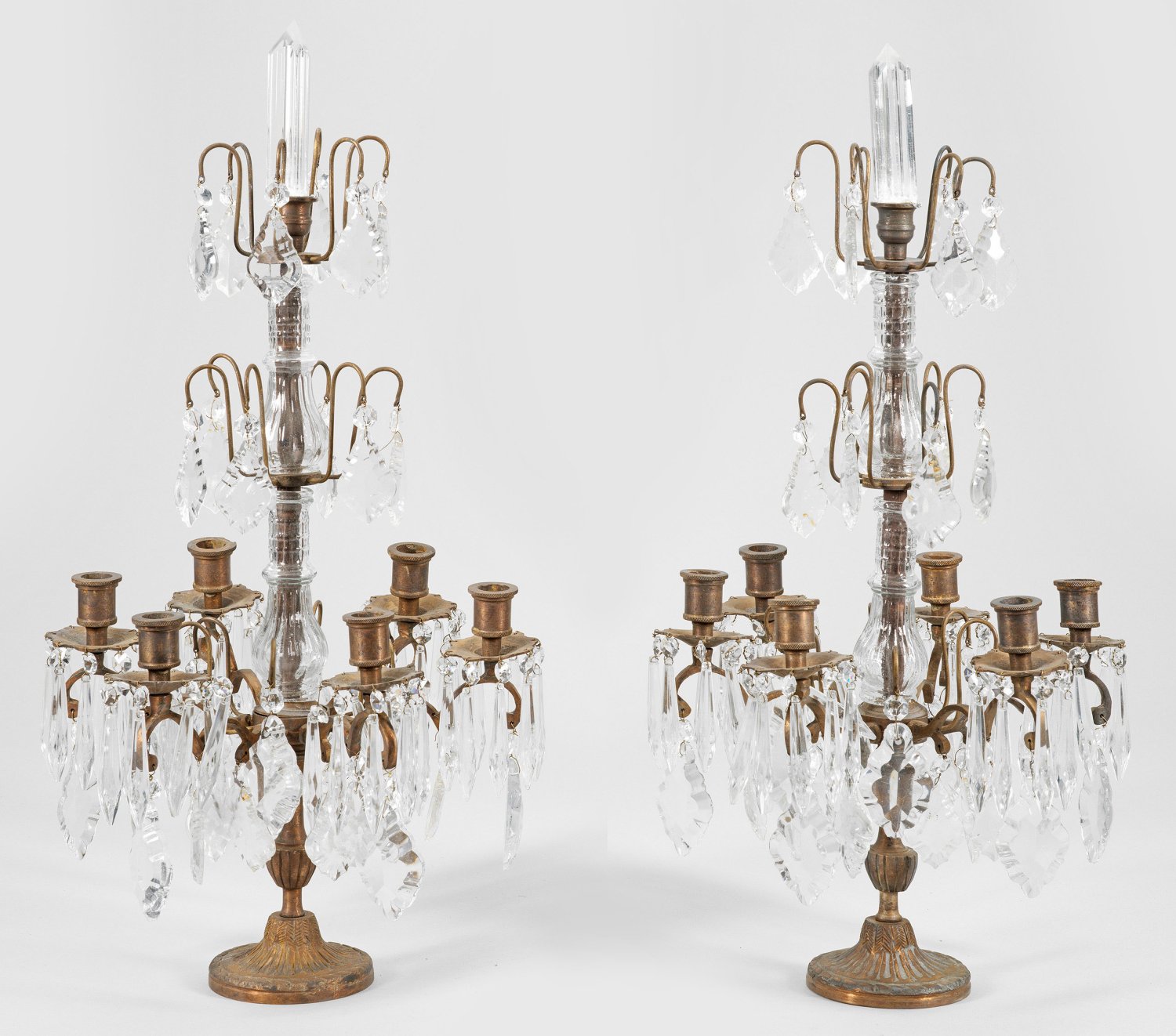 A pair of French brass and glass candelabras.