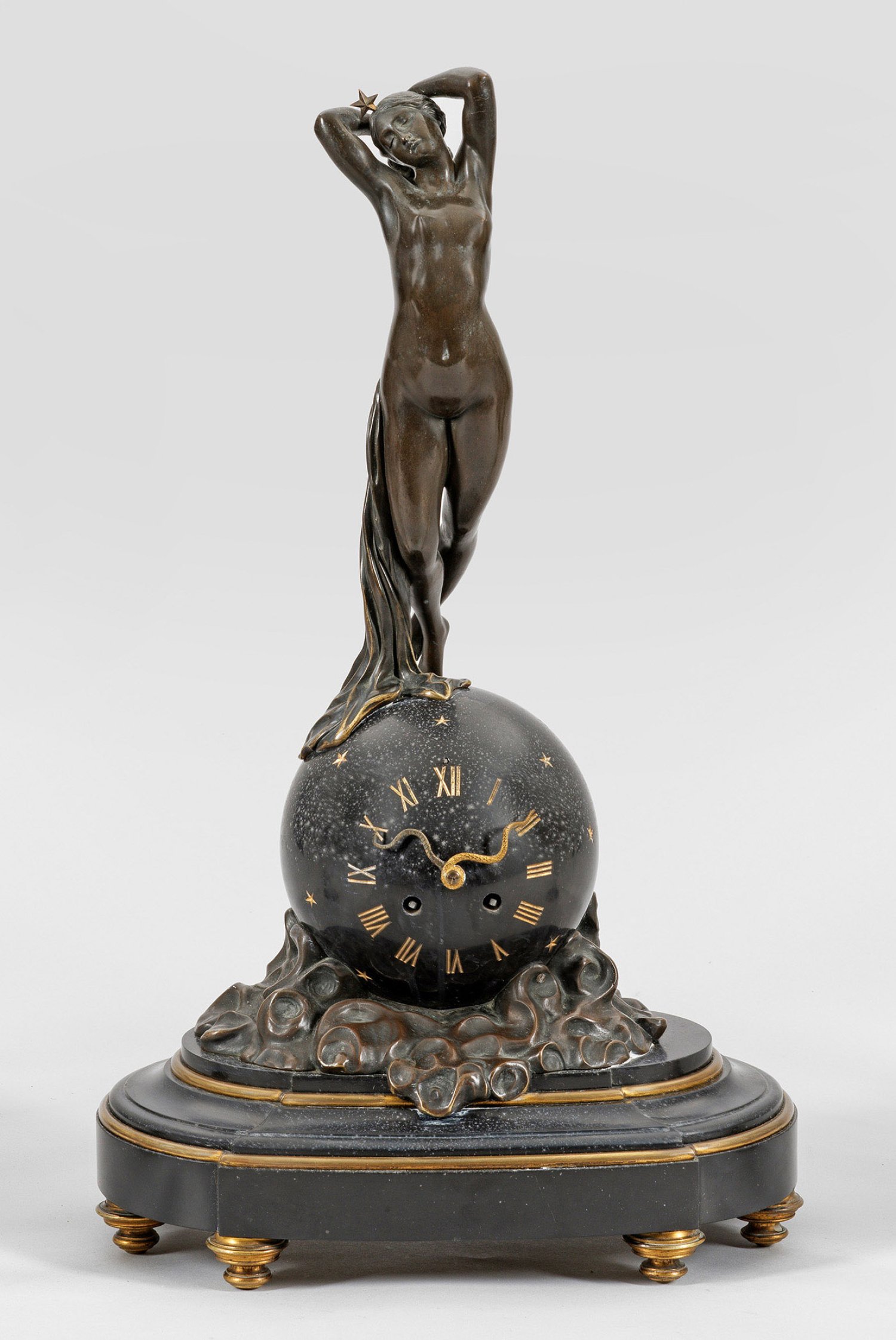 Bronze, dunkel patiniert und anthrazitfarbener Marmor. Über plastischen Wolkenmotiven rundes Uhrengehäuse mit vollplastischer, allegorischer Bekrönung der Nacht. Pendulenwerk mit Pendelfeder sowie Halbstundenschlag auf Glocke. Platine bez. Bordier à Paris. Unterhalb profilierter Sockel. Altersspuren. H. 56 cm.
