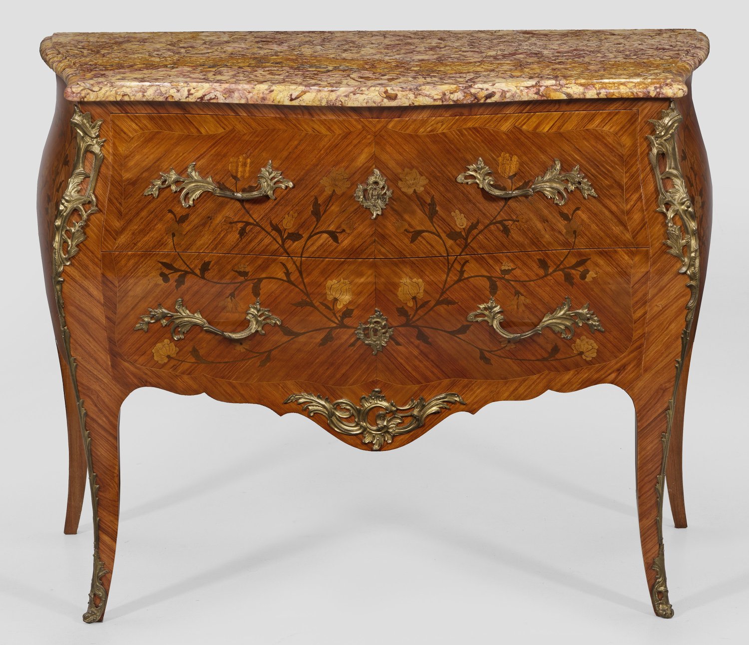 Rosenholz, furniert sowie Einlagen aus unterschiedlichen Hölzern. Dreiseitig bombierter Korpus, flankiert von ausgezogenen Ecklisenen, in schlanke Beine übergehend. In der gegliederten Front zwei Schubladen sans traverse. Flächendeckend gespiegelt angeordnete Furnierfelder mit intarsierten Blüten. Profilierte Deckplatte aus beigefarbenem, gelb und violett gemasertem Marmor. Stempel "Ebenisterie Fehlen". H. 85 cm. 108 cm x 49 cm.