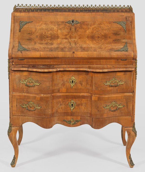 Nussbaum, furniert. Gerader Korpus auf geschwungenen Beinen. In der gegliederten Front zwei gegenläufig geschweifte Schubladen. Schräggestellte, abklappbare Arbeitsfläche. Dahinter gestaffelte Facheinteilung. Oberer Abschluss mit Galerierahmung. Altersspuren. H. 106 cm. 84 cm x 54 cm.