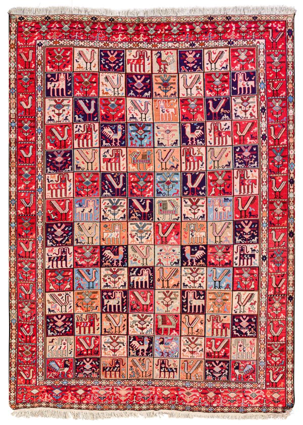 Persien. Seide in Vernettechnik. Im Innenfeld flächendeckende Feldermusterung aus unterschiedlichen Wildtieren und Vögeln auf hellblauem, rotem und beigefarbenem Grund. Umlaufend breite, hellrote Bordüre mit korrespondierendem Muster, begrenzt von schmalen Bändern. 275 cm x 197 cm.