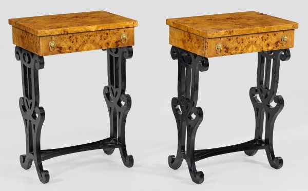 Holz, schwarz lackiert sowie Ahornmaser furniert und akzentuiert. Durchbrochen gearbeitete Seitenwangen als Träger für rechteckigen, einschübigen Zargenkasten, unterhalb durch schmale Stege verbunden. Gering überstehende Deckplatte. H. 73,5 cm. 50,5 cm x 36,5 cm.