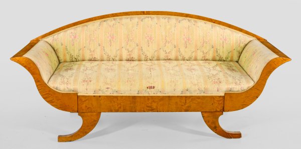 A Baltic birchwood veneered Biedermeier sofa. Signs of use.