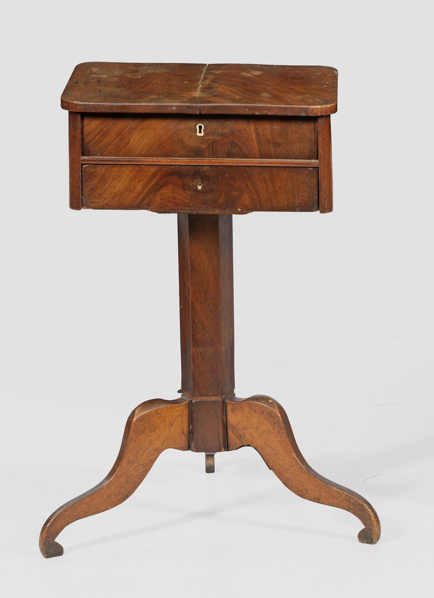 Mahagoni, furniert. Über geschweift ansteigenden Beinen, mehrfach gekanteter Schaft als Träger für zweischübigen Zargenkasten. Gering überstehende Deckplatte. Altersspuren. H. 73 cm. 42 cm x 36 cm.