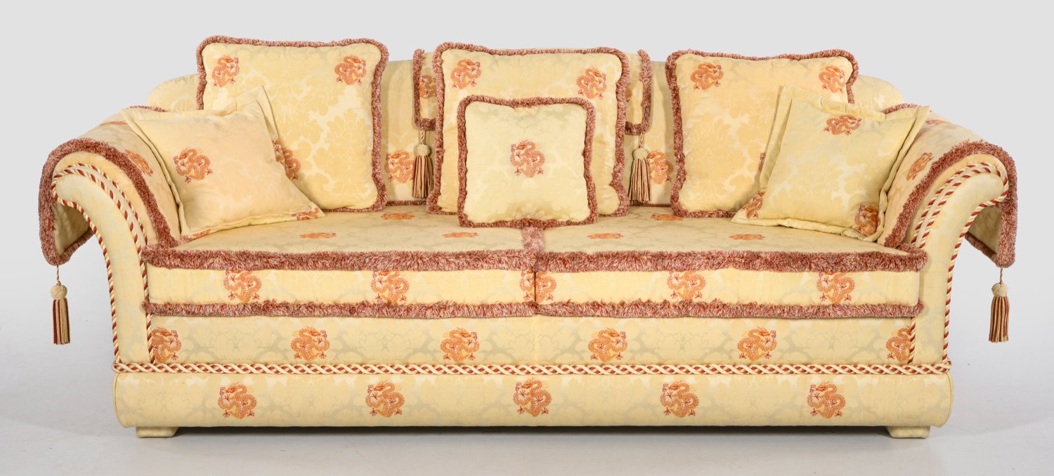 Ecrufarbener Stoff mit Blattkartuschen und chinesischen Drachen. Gerader Korpus mit weit ausschwingenden Armlehnen und gewölbter Rückenlehnenrahmung. Unbez.; H. 86 cm. 234 cm x 95 cm. Sitz-H. 47 cm.