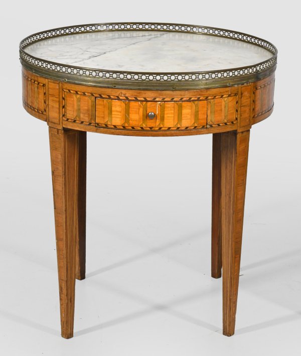 Palisander und Rosenholz, furniert. Bombierte Zarge mit Schubfach und ausziehbarer Abstellfläche auf konischen Vierkantbeinen. Flächendeckend breit gerahmte Furnierfelder. Runde, galeriegerahmte Deckplatte aus weißem, hellgrau gemasertem Marmor. H. 67 cm. D. 61 cm.