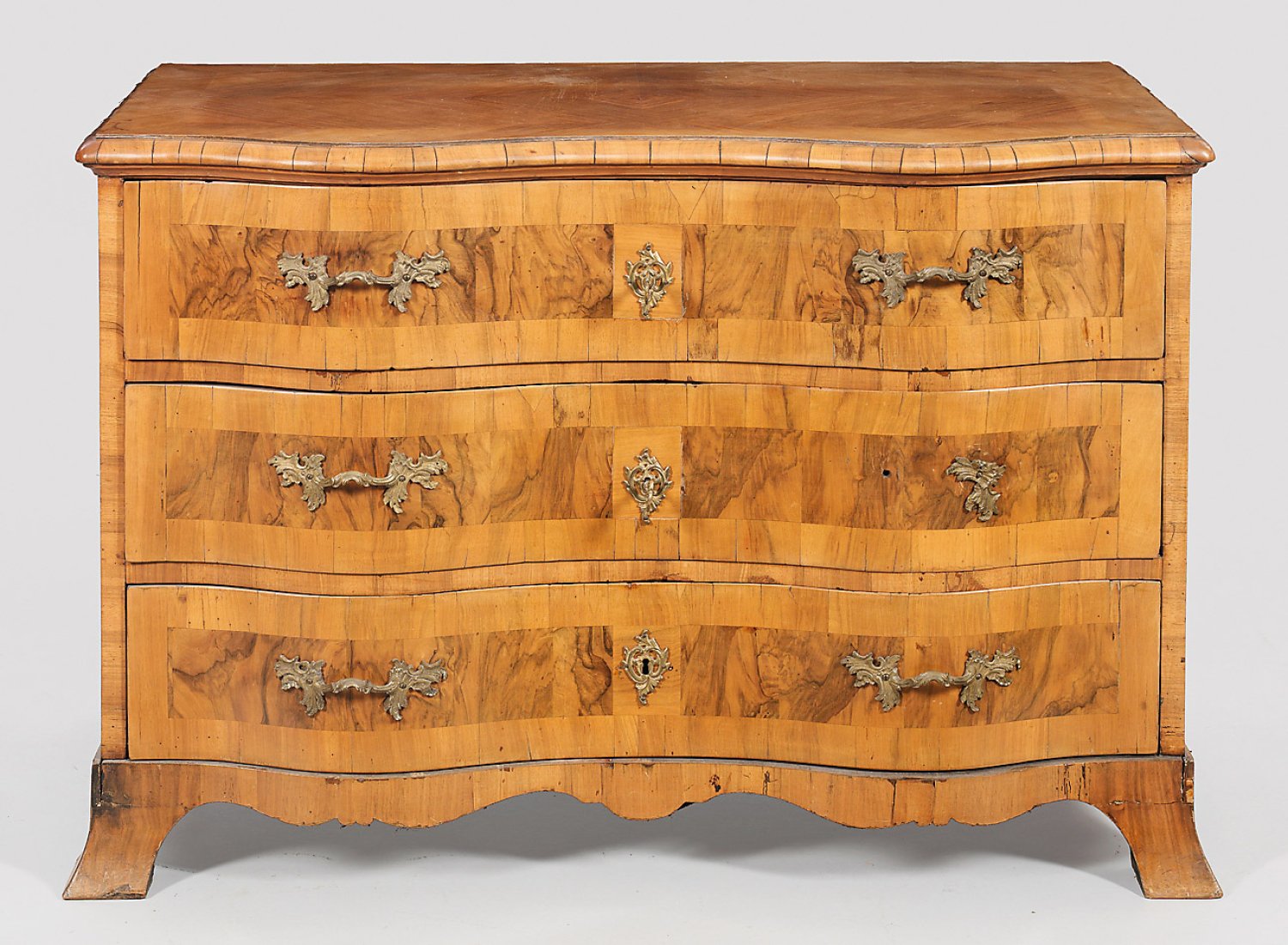 Helles Nussbaum, furniert. Querrechteckig angelegter, in der Front mehrfach geschweifter, dreischübiger Korpus auf ausgestellten Füßen. Profilierte, gering überstehende Deckplatte. Flächendeckend breit gerahmte Furnierfelder. Erg.; H. 81 cm. 121 cm x 60 cm.