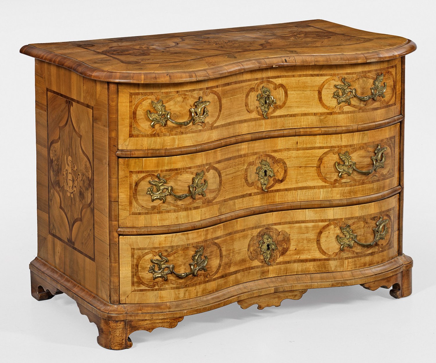 Nussbaum, furniert sowie Einlagen aus Ahorn und Pflaumenholz. Gerader, querrechteckig angelegter Korpus auf flach gekehlter Zarge und gesägten Füßen. In der gegliederten Front drei doppelt geschweifte Schubladen. Korrespondierende, gering überstehende Deckplatte. Flächendeckend breit gerahmte Furnierfelder, von kartuschenförmig angelegten Bandeinlagen begrenzt. Platte mit Blütenintarsien sowie Seiten mit eingelegten Putten. H. 78 cm. 107 cm x 65 cm.