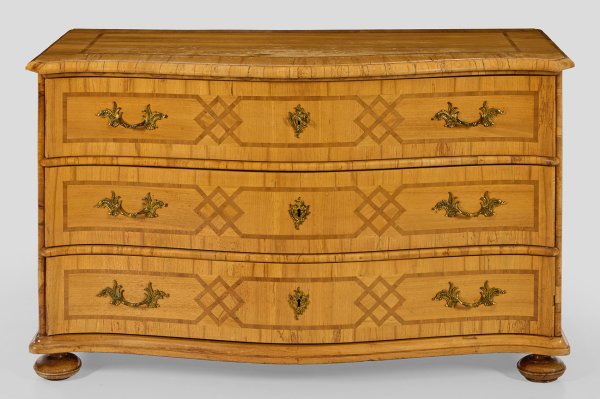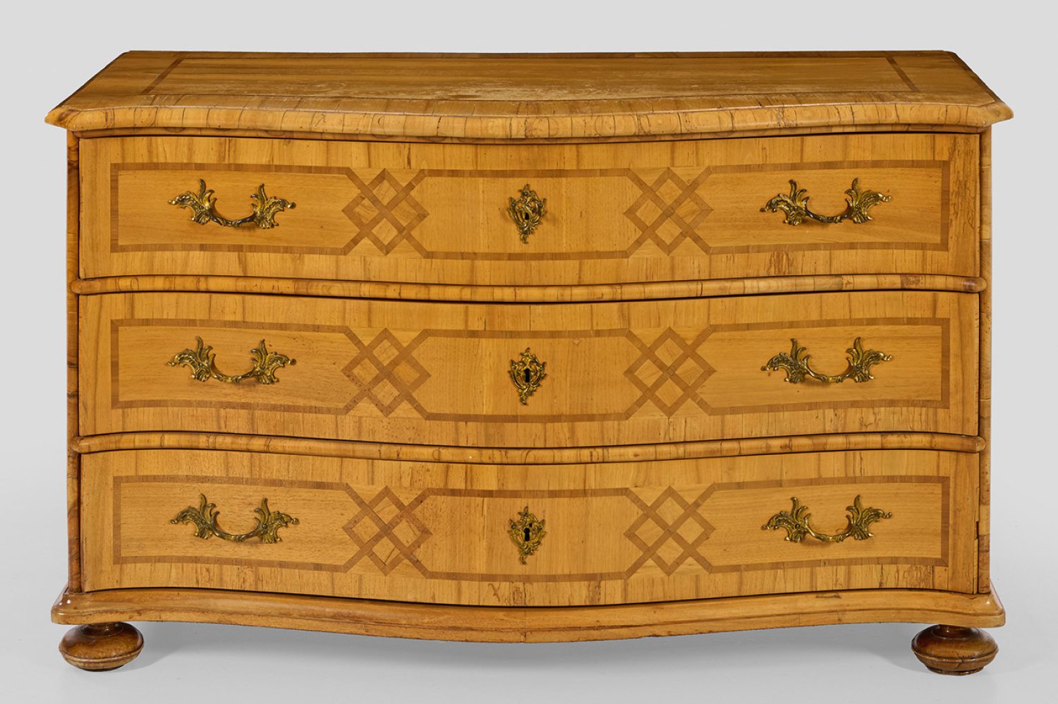 Helles Nussbaum, furniert. Gerader, querrechteckig angelegter Korpus auf gekehlter Profilzarge und gedrückten Füßen. In der gegliederten Front drei breite, leicht geschweifte Schubladen. Gering überstehende Deckplatte. Flächendeckend breit gerahmte Furnierfelder, von Bandeinlagen begrenzt. Erg.; Gebrauchsspuren. H. 81 cm. 136 cm x 66 cm.