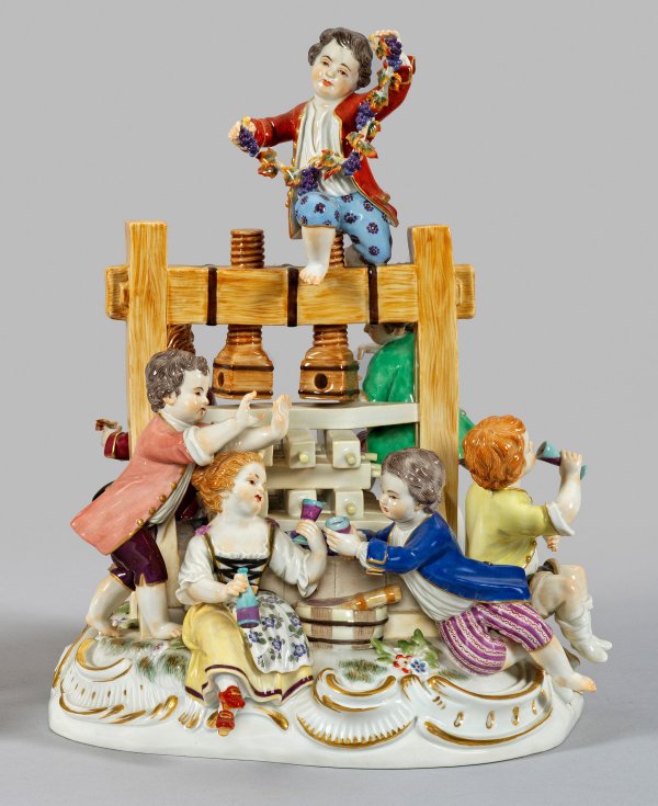 Auf rocaillereliefiertem Sockel große Weinpresse, umgeben von sieben Winzerkindern beim Pressen von Trauben. Schauseitig stehender Winzerjunge sowie drei weitere Winzerkinder, aus gefüllten Weingläsern trinkend. Oberhalb sitzender Knabe mit Weingirlande. Polychrome Malerei mit Goldstaffage. Modell-Nr. 61035. Ohne Stab. Minim. best.; Schwertermarke. H. 25,5 cm.