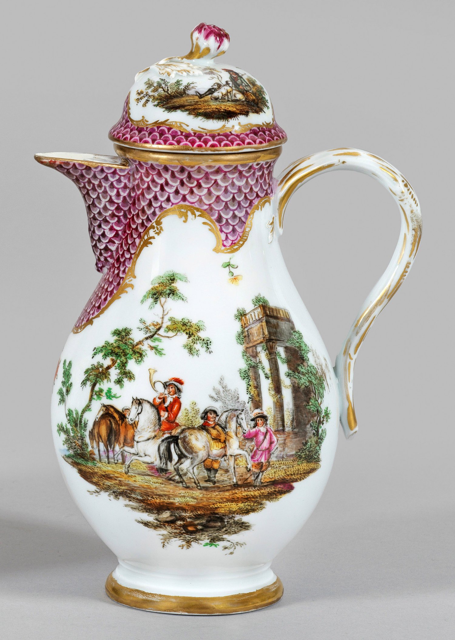 Birnförmiger Korpus mit seitlichem Asthenkel und Schnabelausguss. Aufgewölbter, von plastischer Blüte bekrönter Deckel. Auf Schulter und Deckelrand purpurfarbener Schuppenmosaikdekor, teilw. gestreute Blüten. Beidseitig der Wandung und auf dem Deckel szenische Darstellungen einer höfischen Jagdgesellschaft in architekturbestandener Landschaft. Polychrome Malerei mit Goldstaffage. Rest.; Minim. best.; Schwertermarke. H. 22 cm.