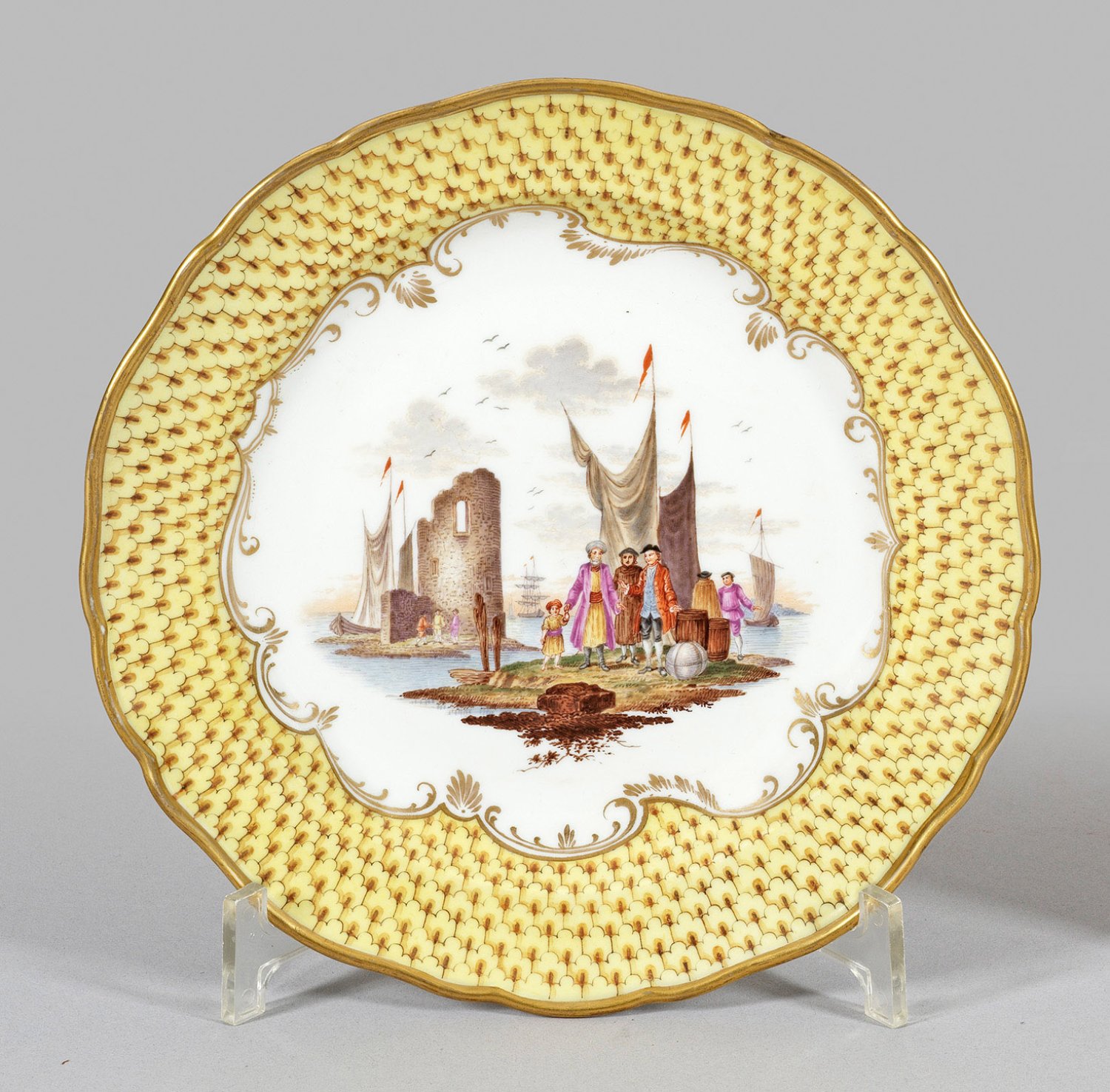 Runde Form mit passig geschweiftem Goldrand. Spiegelfüllende, von mehrpassiger Goldornamentbordüre eingefasste, architekturbestandene Hafenszene mit orientalischen und europäischen Kaufleuten. Auf der Fahne zitronengelber Schuppenmosaikfond. Polychrome Malerei mit Goldstaffage. Minim. ber.; Schwertermarke. D. 21 cm.